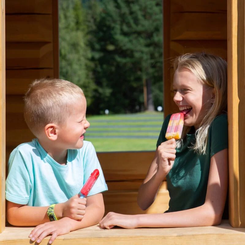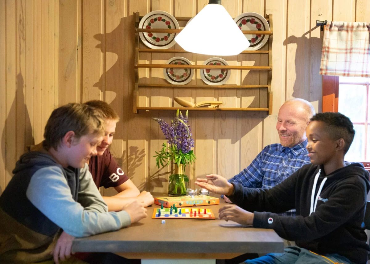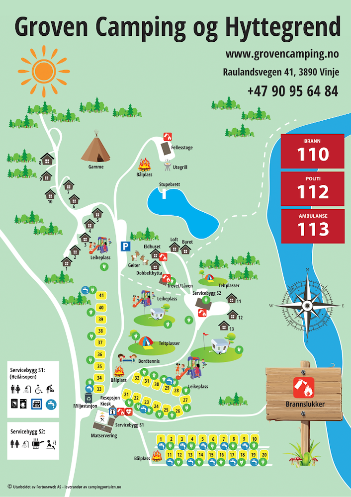 Du finn puter og dyner i hyttene, og det er lett tilkomst til leikeplass, geiter og badedam.