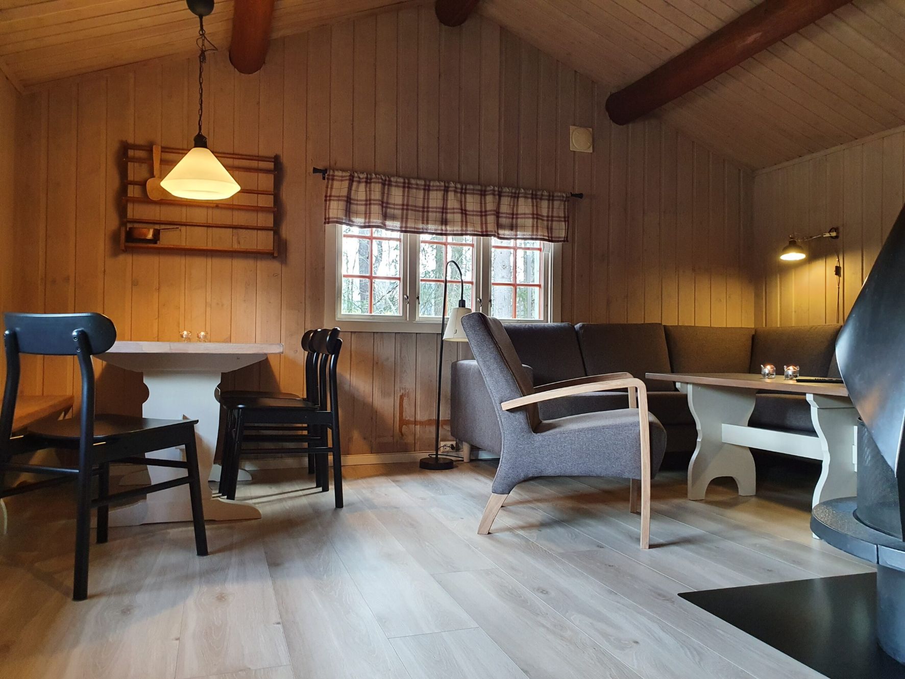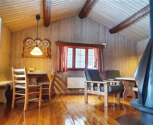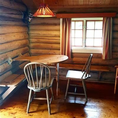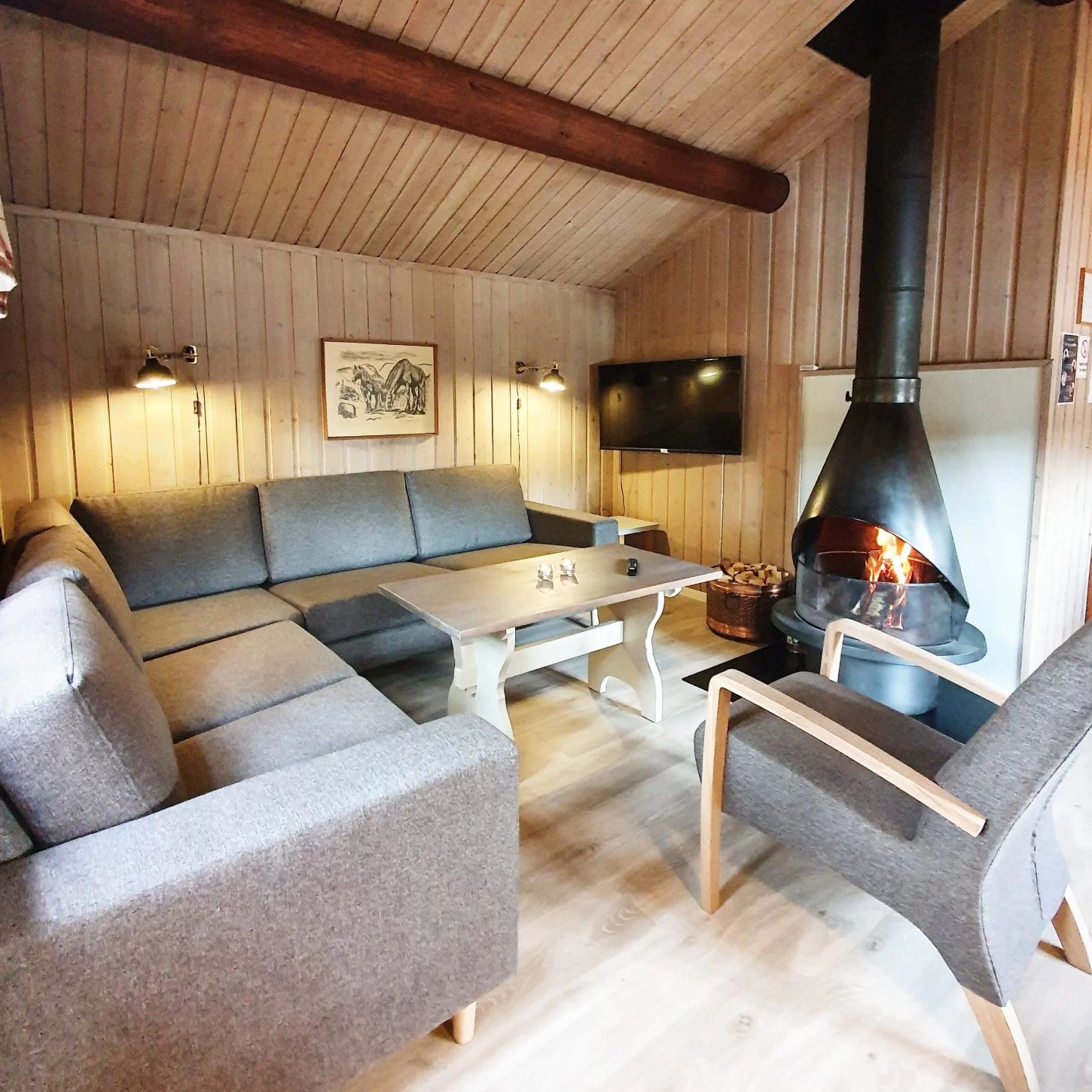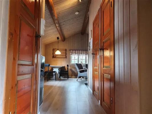 Stoge med hjørnesofa, 43” TV og peis med open eld, kjøken med innlagt vatn, komfyr, kjøleskåp, kaffitraktar og spisbord. Enkelt bad med dusj og toalett samt bu med fryseskap, ved og vaskesaker.
