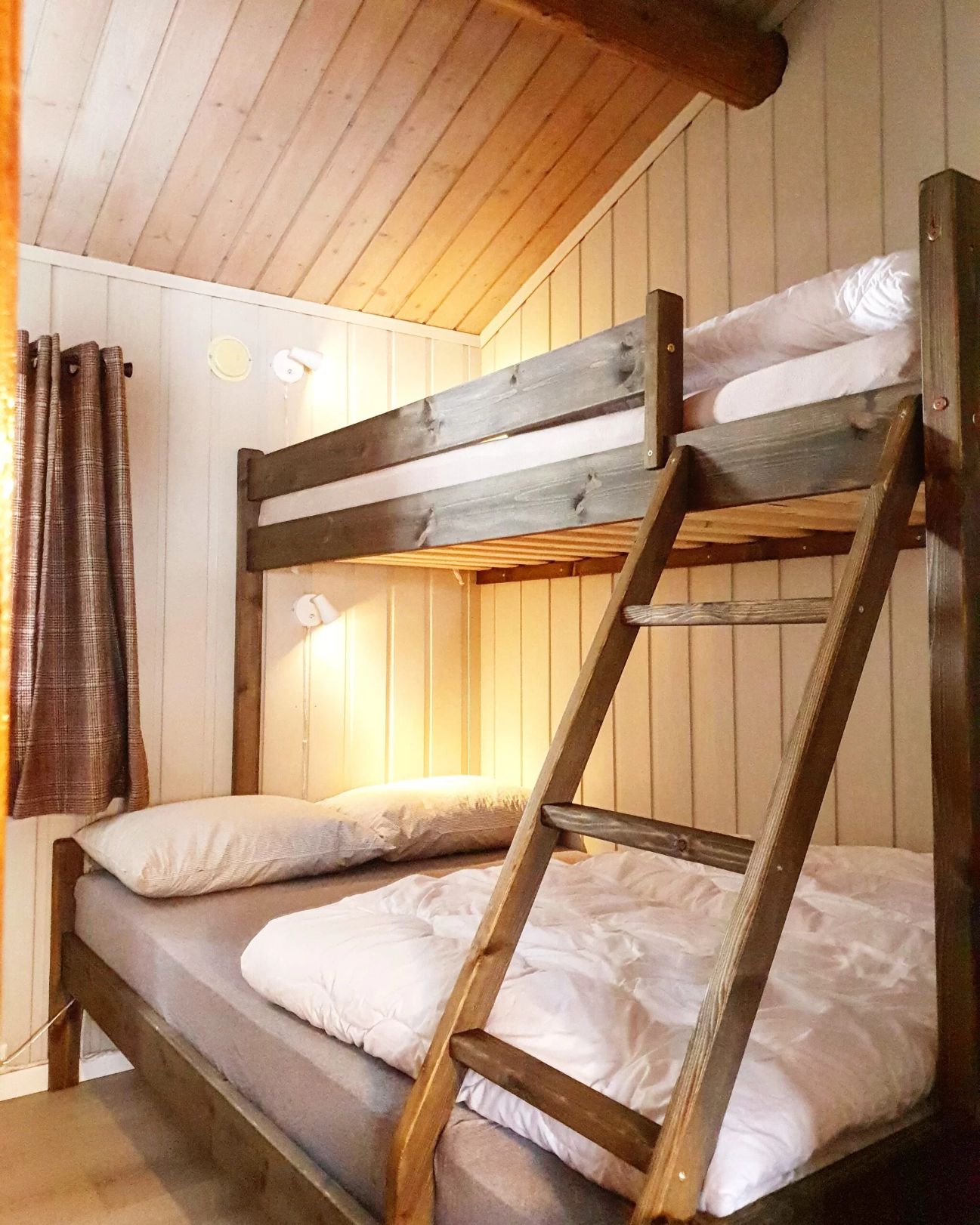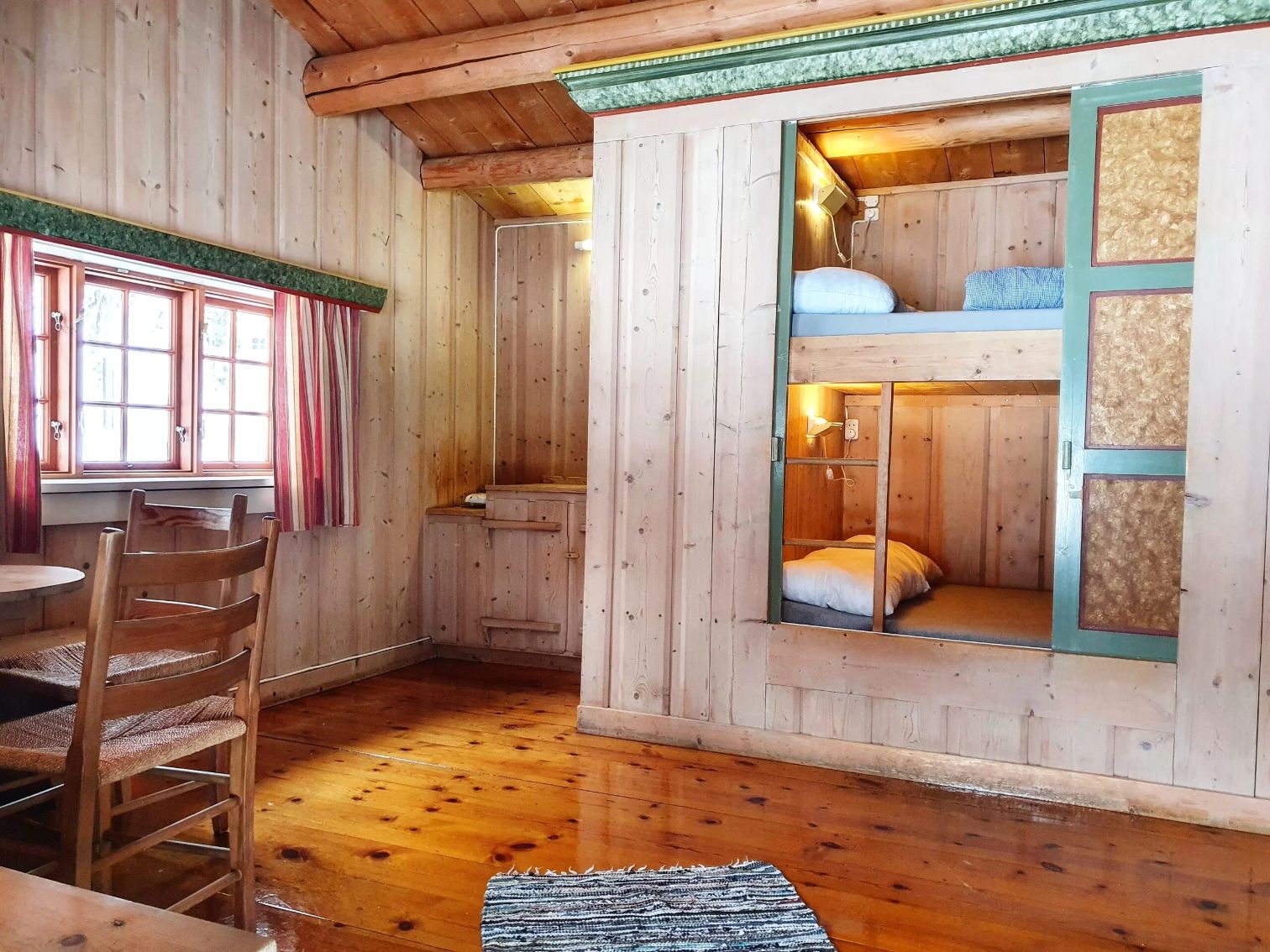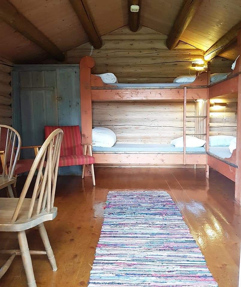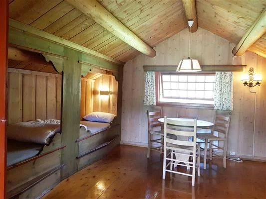 Hyttene har to soverom – eit soverom med enkel køyeseng og det andre med familiekøye (underkøya er 120 cm brei).