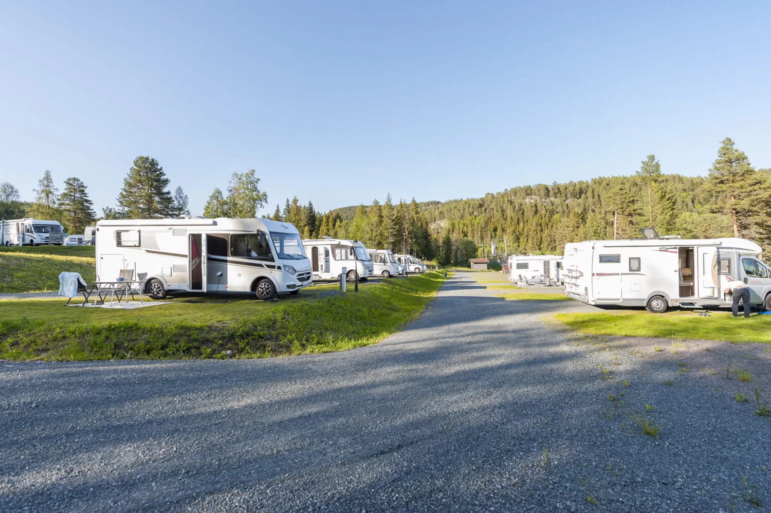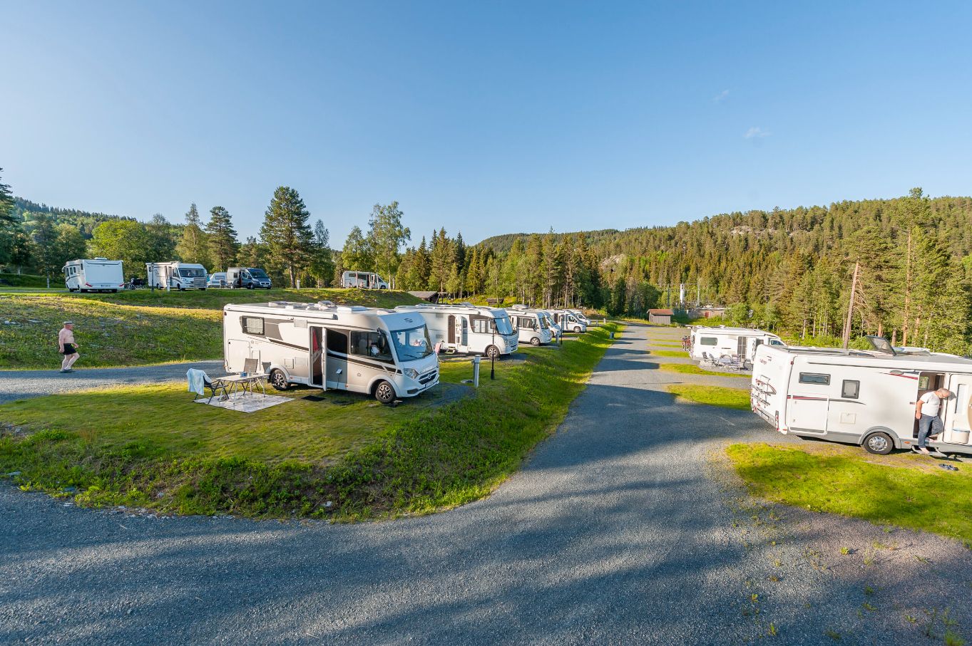 Me har 41 bubilplassar med eigen plen og straumtilknyting, moderne sanitæranlegg og frittståande tømmestasjon.