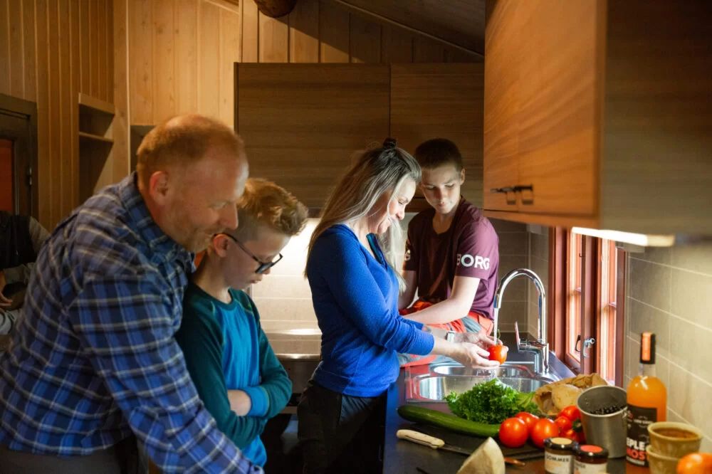 Me tilbyr ti nyrenoverte heilårshytter med kjøken og bad.